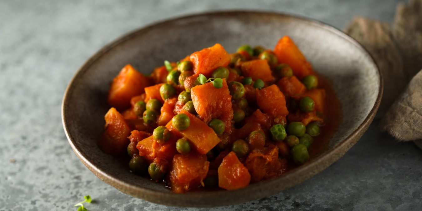 Добавьте помидоры вместе с соком, замороженный горошек, воду, чеснок, соль, перец, тмин и мускатный орех.